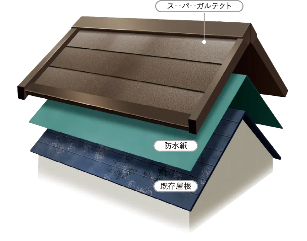 ノンアスベスト屋根は素材の特性上、塗装による密着が弱く、経年劣化による粉化や剥離が起こりやすいことから、再塗装が困難です。こうした理由から、屋根カバー工法で新たな屋根材を被せることで、劣化した屋根の安全性を確保しながら、住まいの耐久性を向上させることが可能となります。