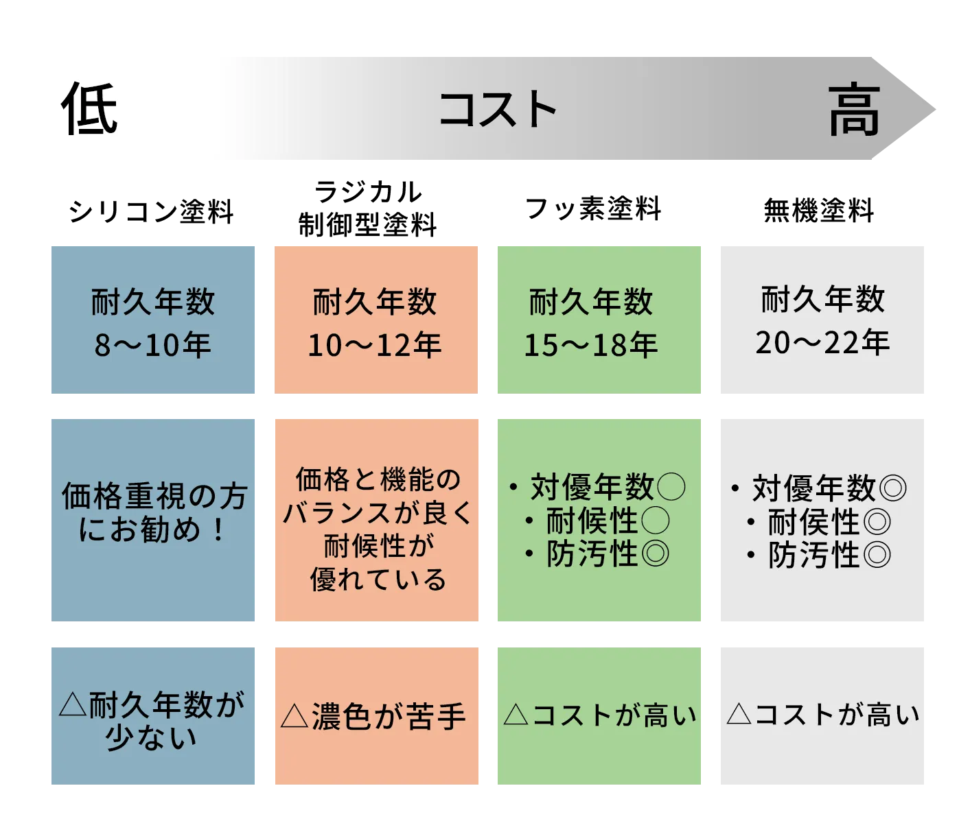 シリコン塗料、フッ素塗料、無機塗料など種類の多さゆえにどの塗料を選ぶのがベストなのか、余計に悩むようになってしまうケースはよくあります。
